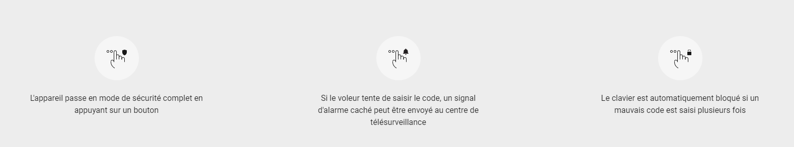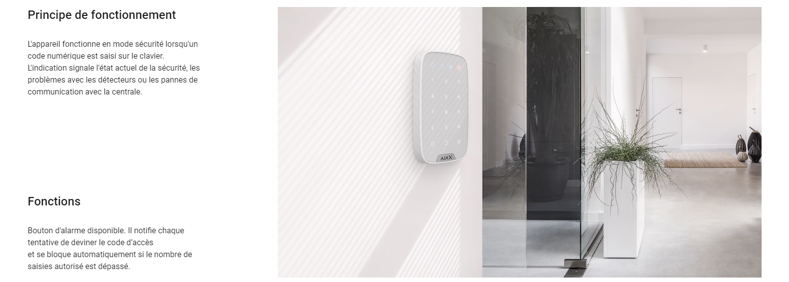 • Le KeyPad se verrouille pendant 3 à 180 minutes si un code incorrect est saisi 3 fois de suite en 1 minute. Un PRO ou un utilisateur disposant de droits d’administrateur peut régler le temps de verrouillage dans l’application Ajax.