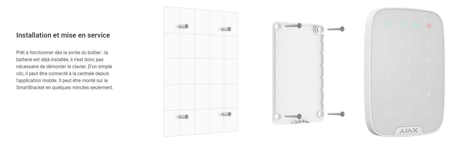 • Le clavier numérique sans fil est utilisé pour armer/désarmer le système de sécurité Ajax. Il est monté dans la pièce près de la porte d’entrée pour permettre un accès rapide au clavier.