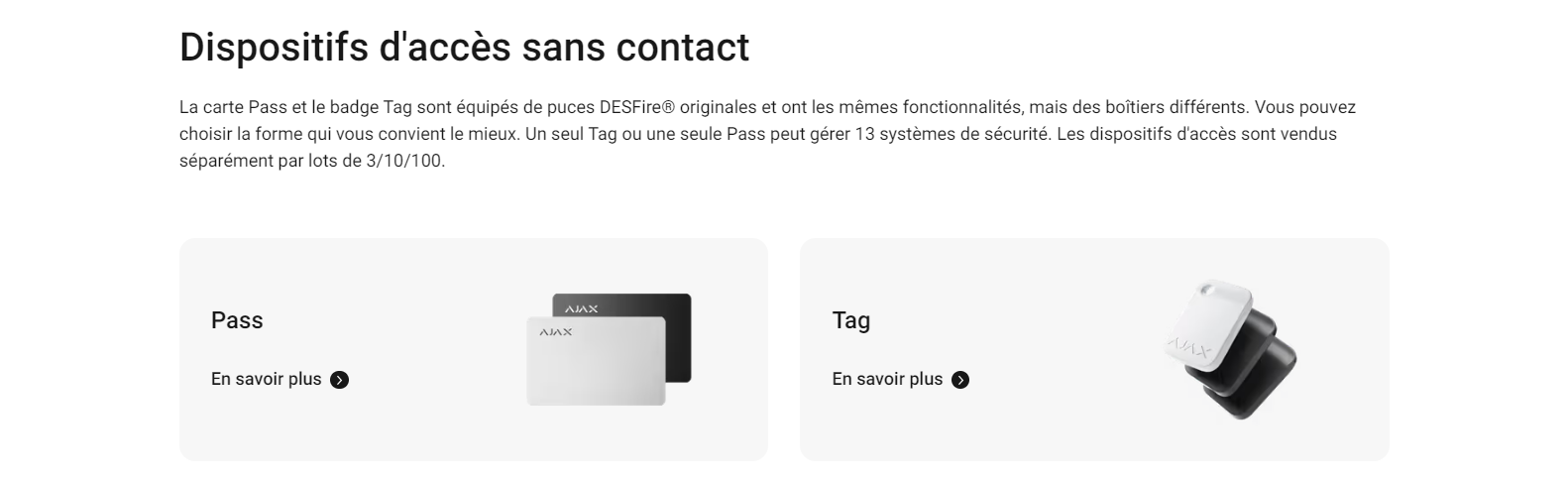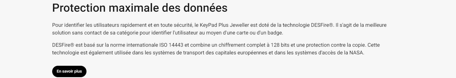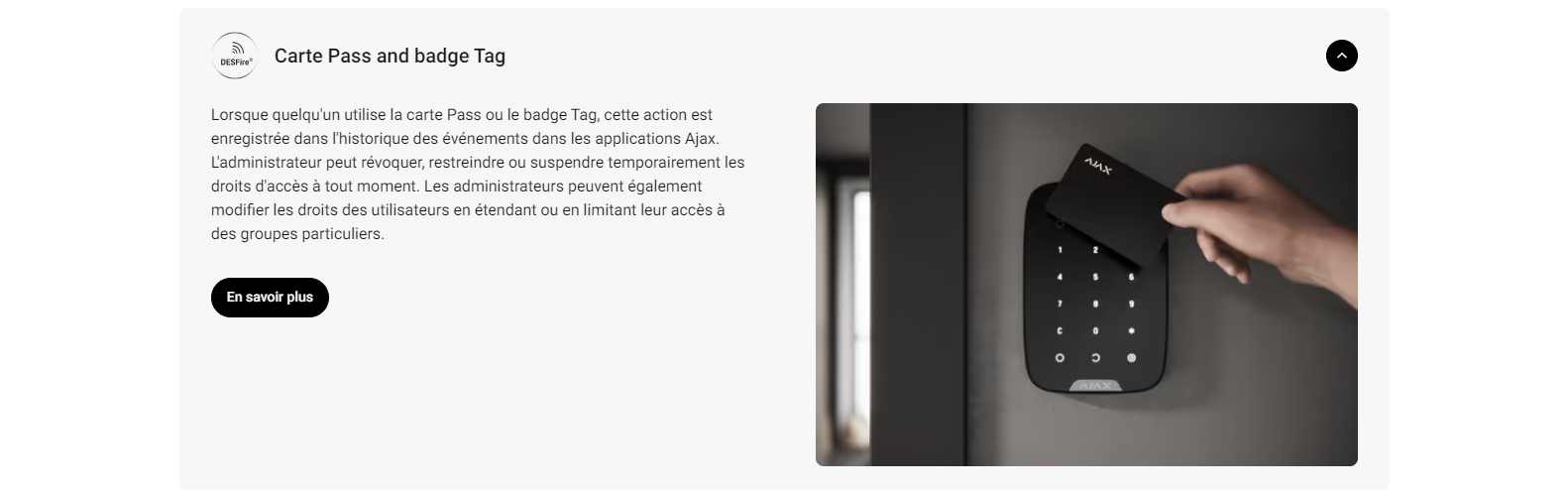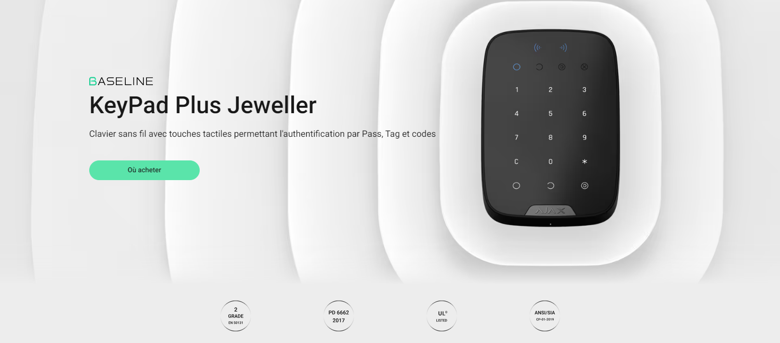 • KeyPad Plus Jeweller permet une gestion transparente et sécurisée d’un système Ajax. Pilotez les modes de sécurité, activez le Mode nuit et gérez des groupes spécifiques à l’aide d’un seul et même dispositif. KeyPad Plus prend en charge les cartes Pass et les badges Tag avec des puces DESFire®️ inviolables, ainsi que divers codes d’accès. Le dispositif est connecté sans fil à une centrale à une distance maximale de 1 700 m1. La batterie dure jusqu’à 3,5 ans.