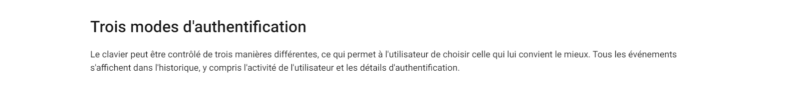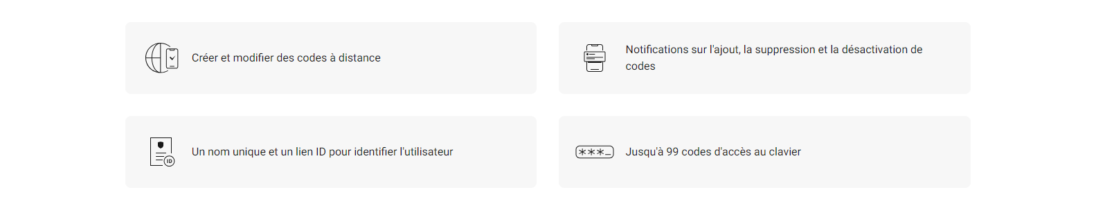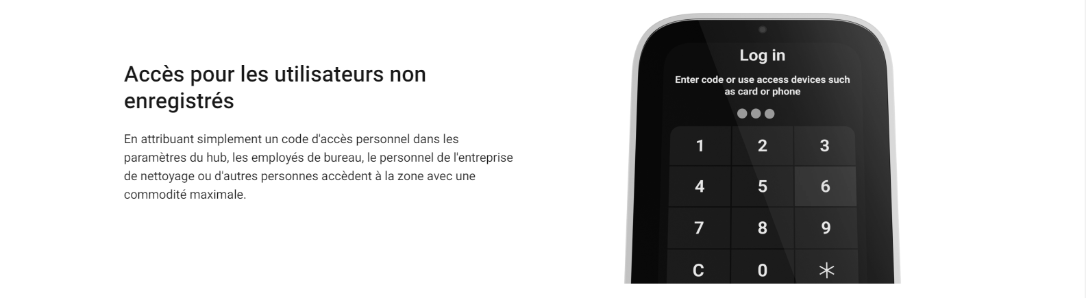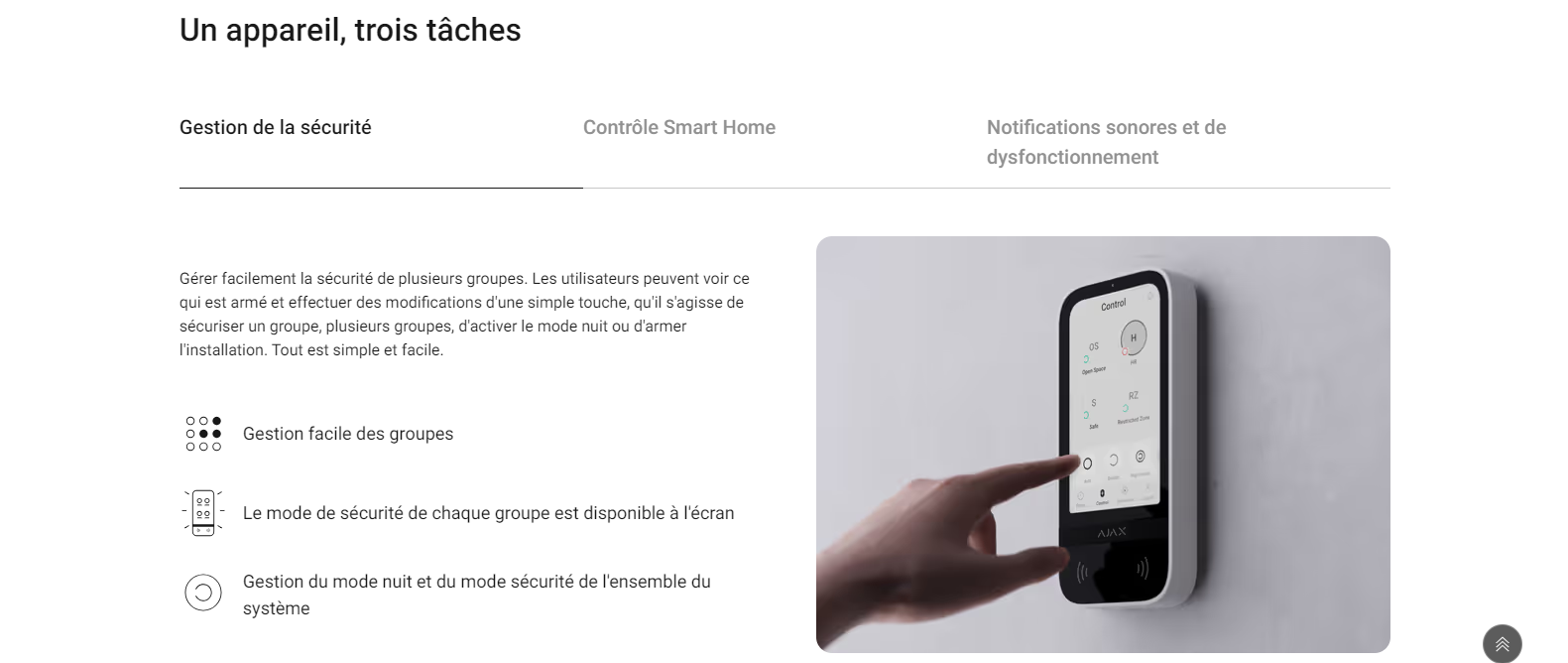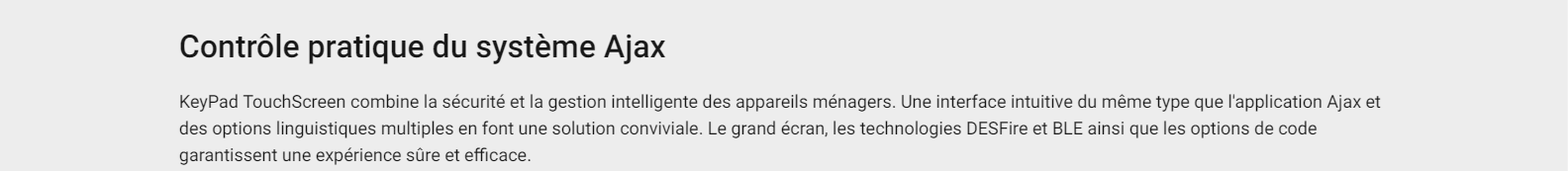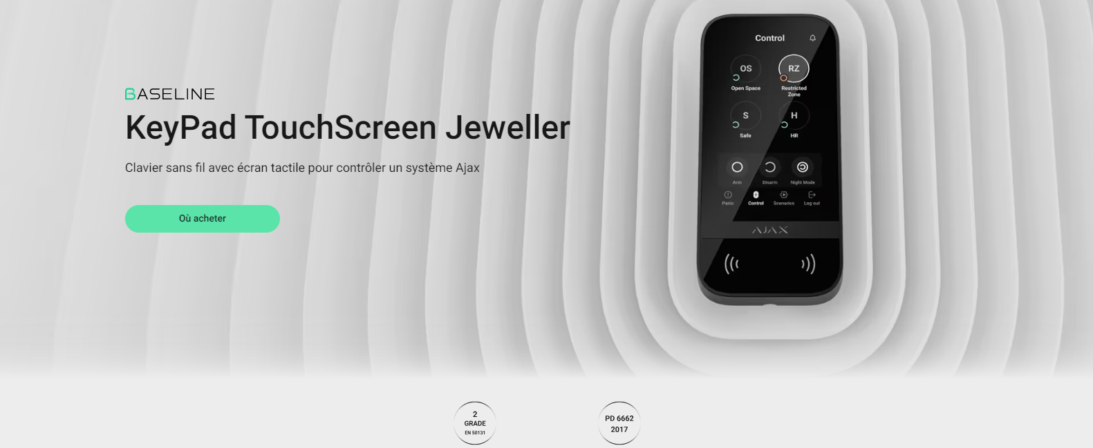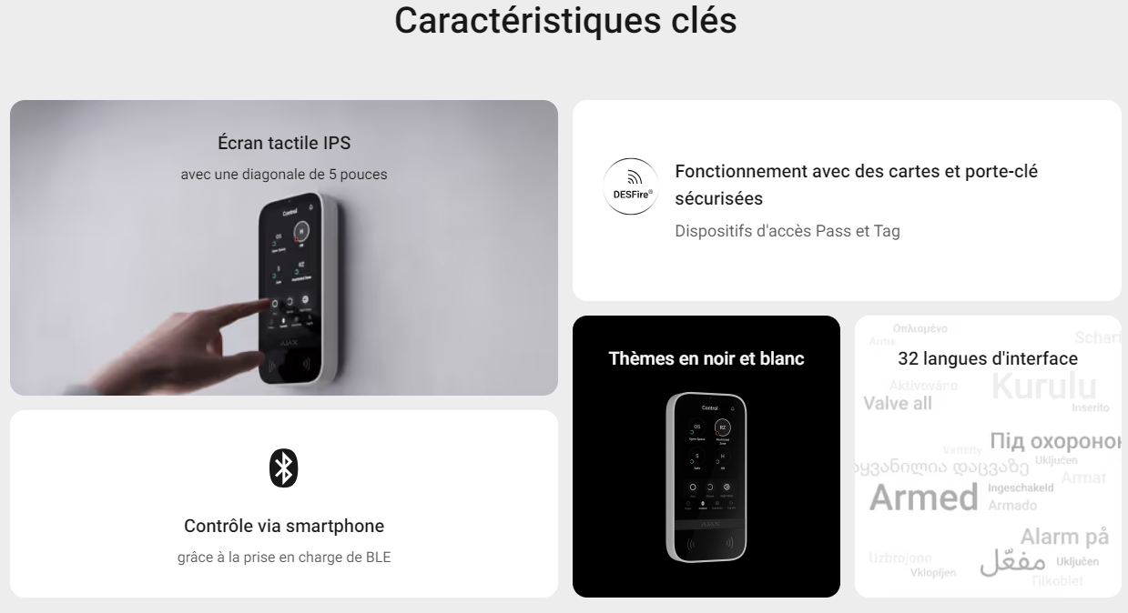 • KeyPad TouchScreen combine la sécurité et la gestion intelligente des appareils ménagers. Une interface intuitive du même type que l’application Ajax et des options linguistiques multiples en font une solution conviviale. Le grand écran, les technologies DESFire et BLE ainsi que les options de code garantissent une expérience sûre et efficace.
