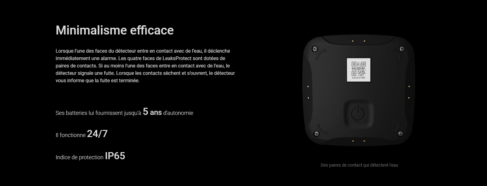 • Tous les quatre côtés du dispositif ont des paires de contact. LeaksProtect Jeweller détecte les premiers signes d’inondation dès que l’eau atteint au moins l’une d’entre elles.