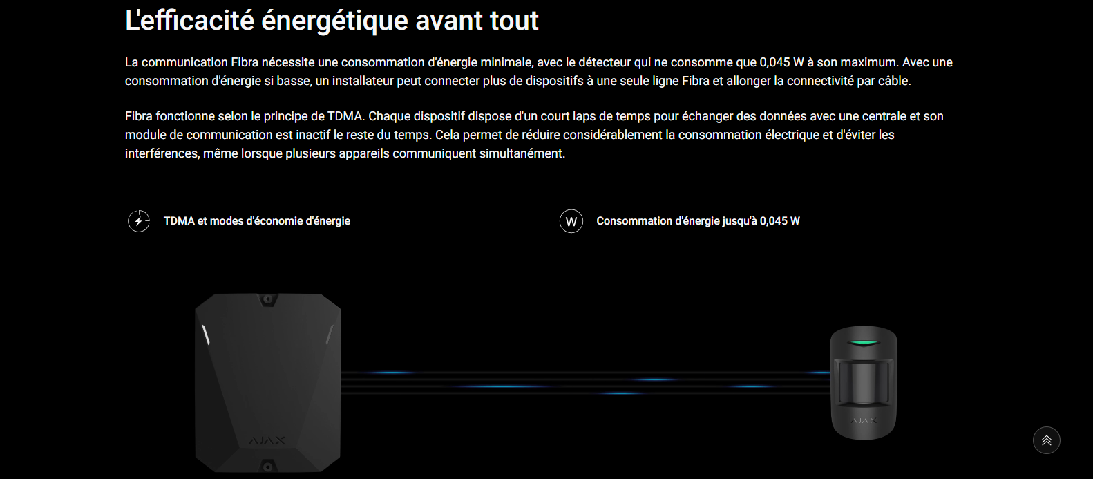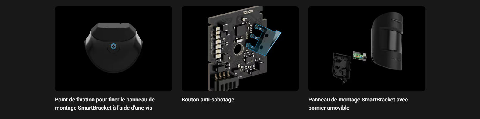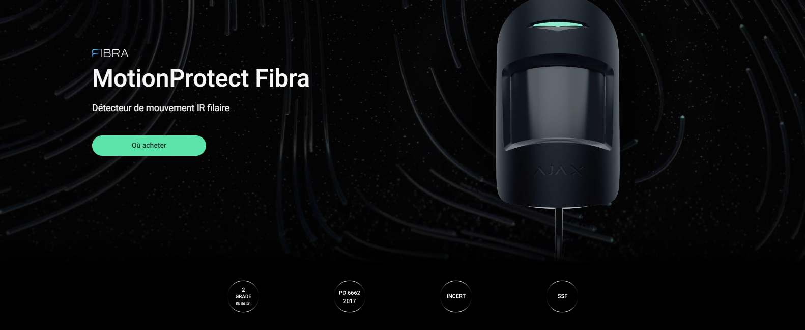 • MotionProtect Fibra est un détecteur filaire de mouvement. Il s’agit d’un composant essentiel du système de sécurité, c’est pourquoi nous avons conçu ce dispositif pour qu’il offre une fiabilité et un confort d’utilisation inégalés. Des algorithmes hardware et software de pointe réduisent les déclenchements intempestifs à presque zéro. Avec son design moderne, MotionProtect Fibra se marie parfaitement avec n’importe quel contexte. Le panneau de montage SmartBracket simplifie l’installation, tandis que la configuration dans l’application élimine la nécessité pour les ingénieurs de se rendre sur place pour résoudre des demandes mineures.