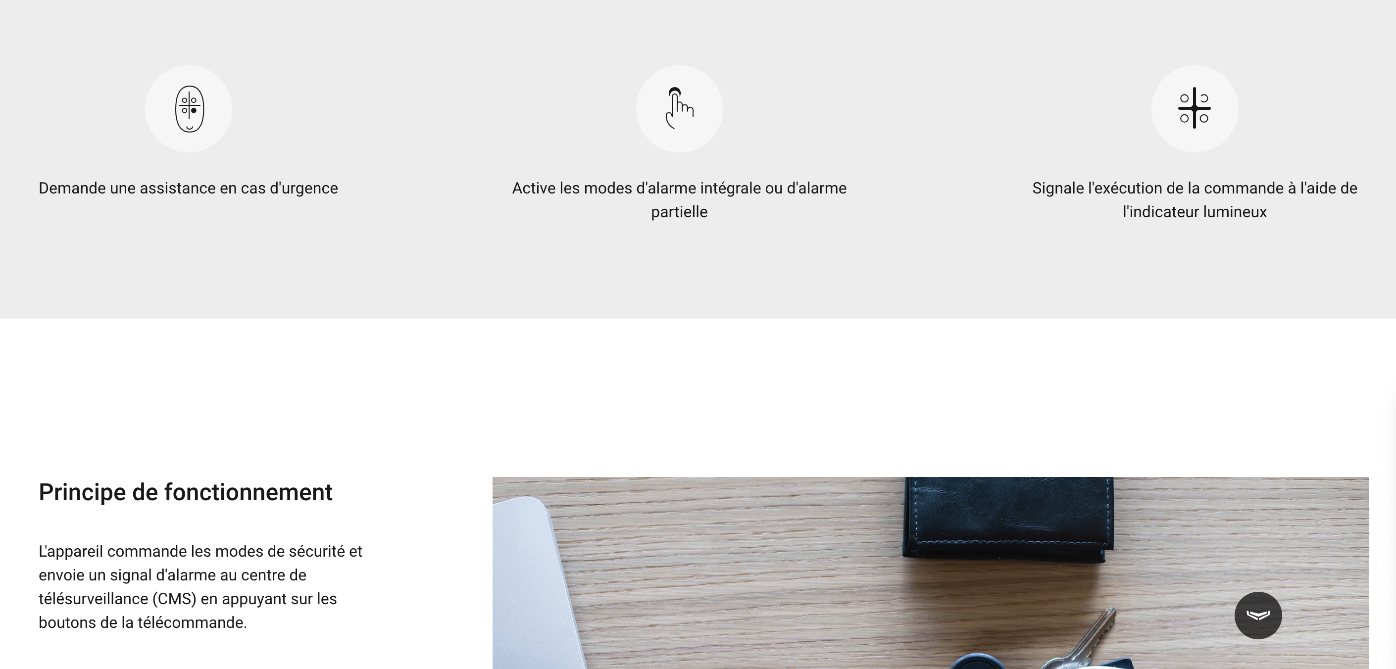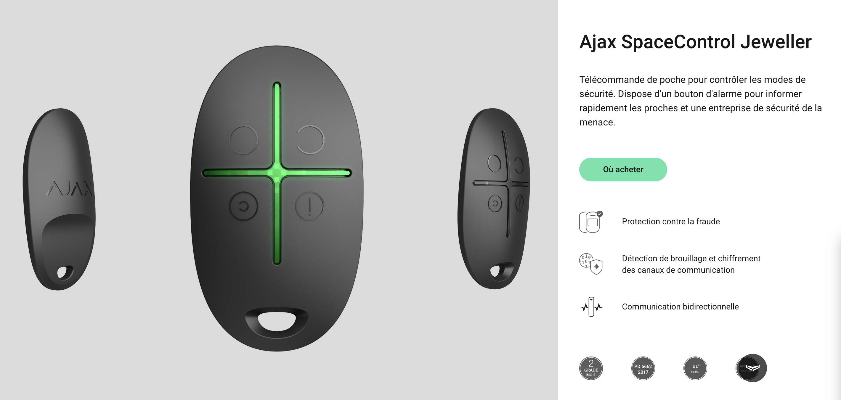 Télécommande de poche pour contrôler les modes de sécurité. Dispose d’un bouton d’alarme pour informer rapidement les proches et une entreprise de sécurité de la menace.